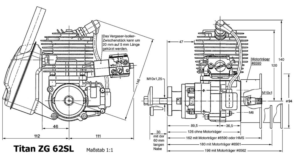 The Titan ZG 62 was first produced in 1985 being designed so as to fit into a chain saw and at the same time being able to be used for model purposes without modification. The sales volume with the ZG 38 for models made this possible.
